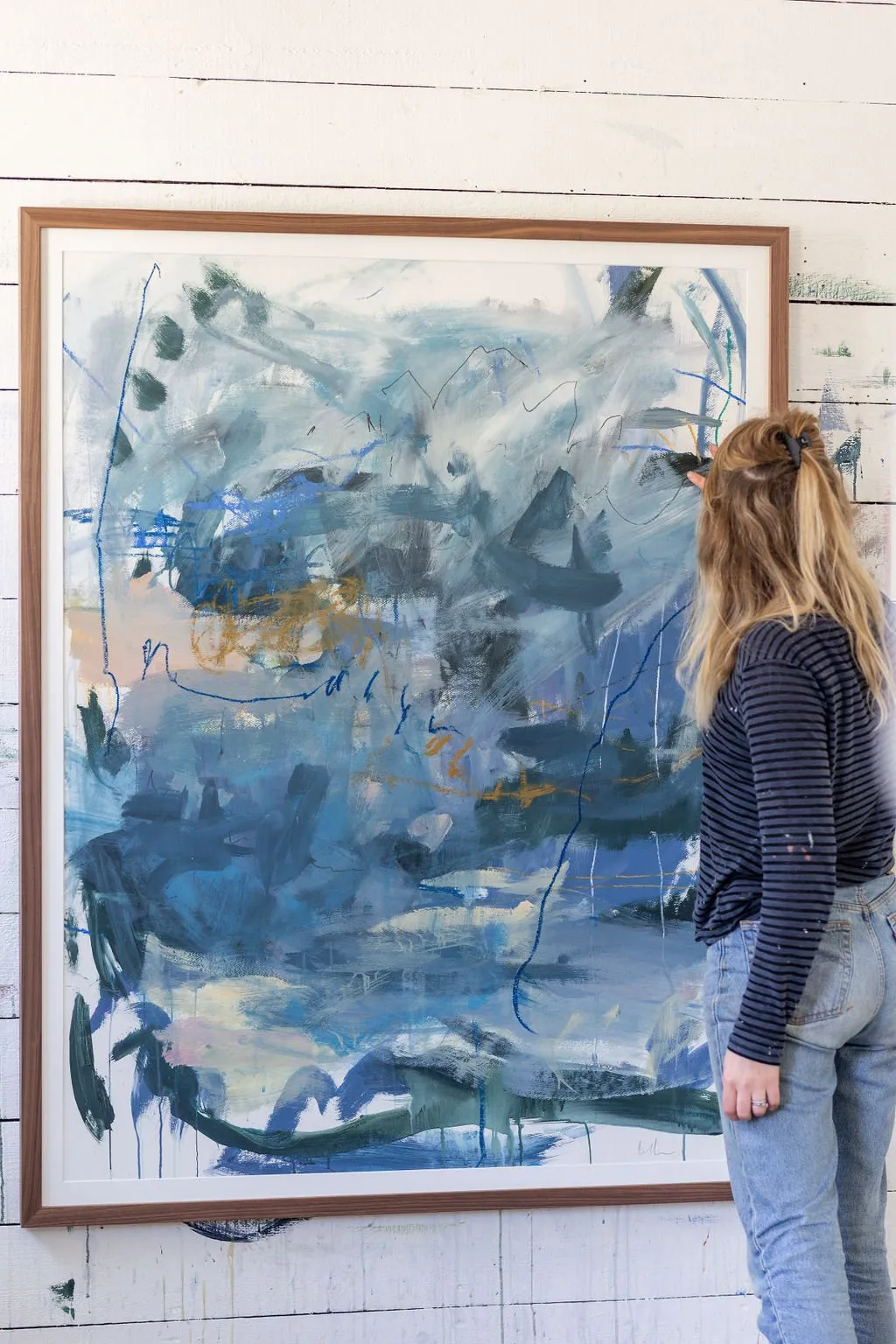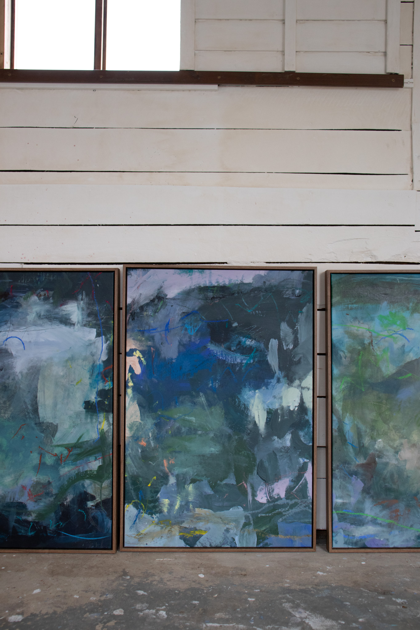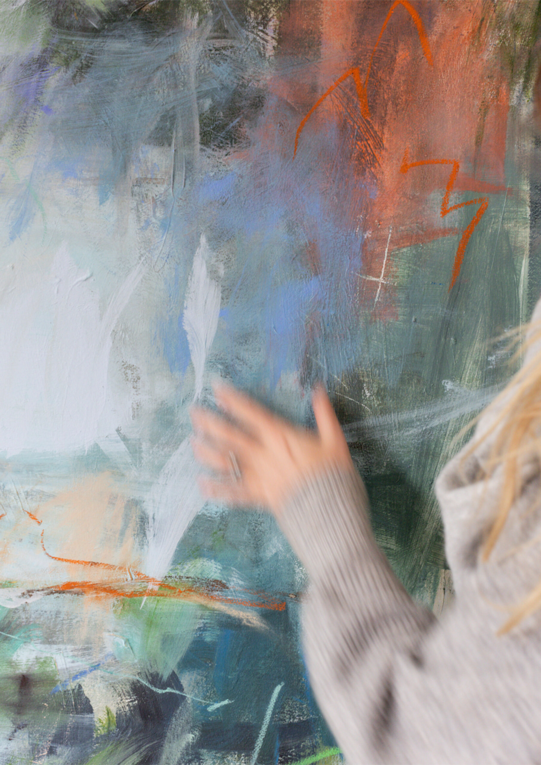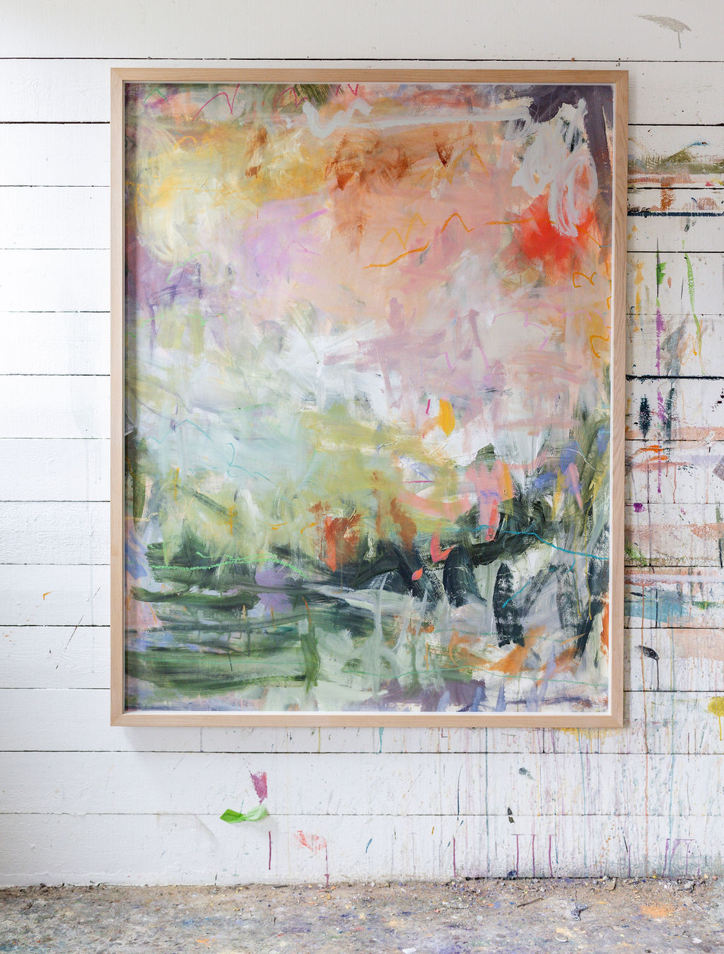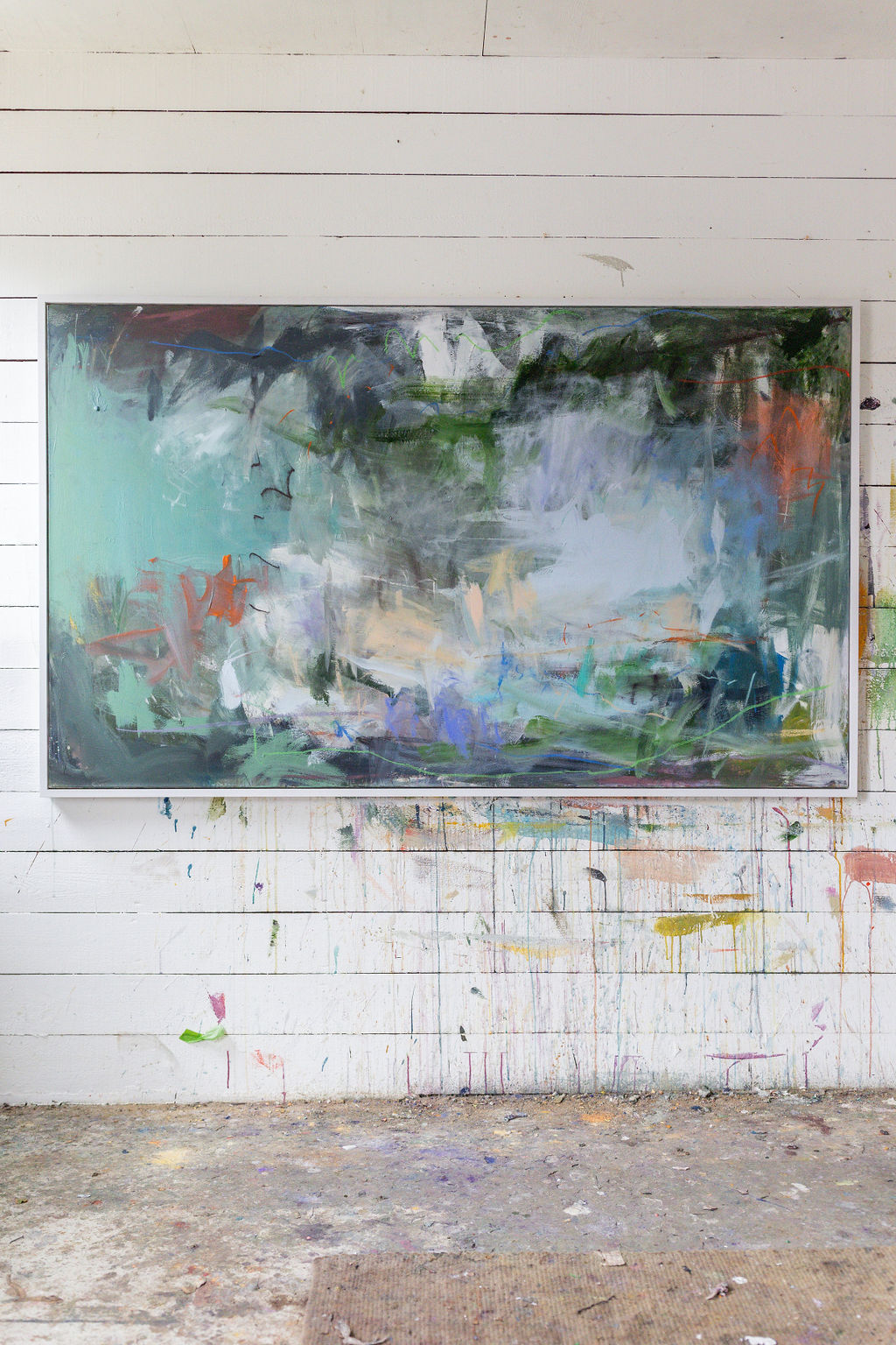 I never want a painting to feel too safe. Towards the end, if it feels too restrained, I might grab a big brush and make a bold, sweeping mark—something unexpected that brings strength and bravery to the composition. Lately, I’ve been drawn to incorporating more lines, almost lightning-like shapes. I’m not entirely sure where that’s coming from, but I’m rolling with it. That’s the beauty of painting—you follow where it takes you.