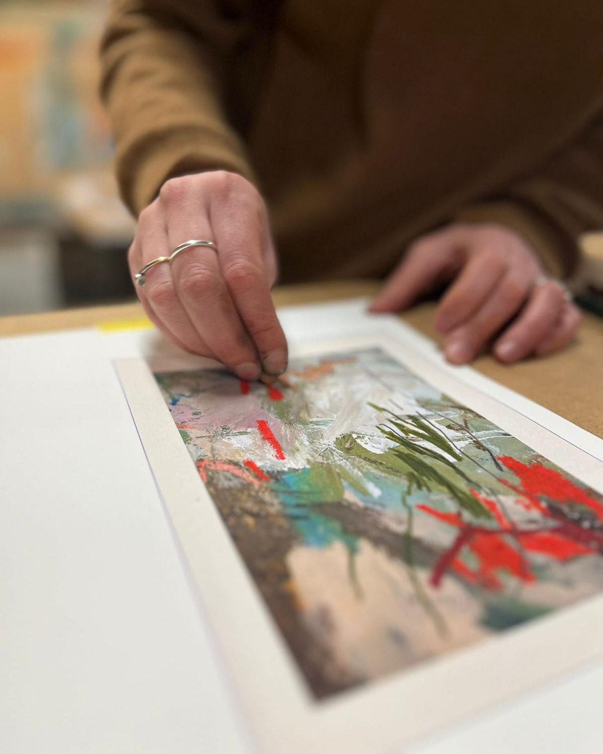 I never plan a painting—it just evolves. It starts energetically, almost chaotically, with instinctive, impulsive marks. Colour often leads the way; I’ll suddenly feel like a piece needs a burst of something—maybe a pop of mustard, maybe a deep blue—and that choice will spark the next move. The process slows as the painting develops. I become more careful, more considered, but I’m always conscious of keeping the energy alive.